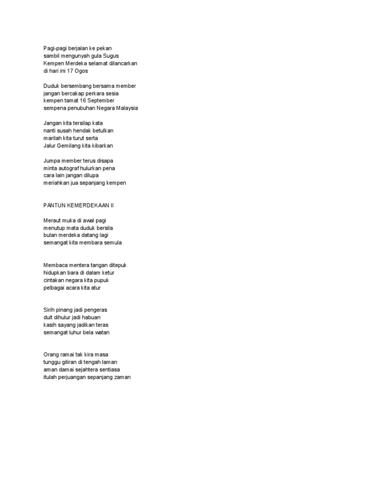 Koleksi Pantun dan Sajak Kemerdekaan admin February 9 2019 Sudah menjadi tradisi di setiap sekolah di mana apabila bermulanya bulan Ogos pastinya rancangan dan program berkaitan sambutan kemerdekaan negara akan diadakan bagi memupuk semangat patriotik dan sifat cintakan negara di kalangan diri murid. Bangkai di dalam Telaga. Simak yang tercatat dalam tanggalan jawa tentang Weton dan Neptu 17 Agustus 2022 Hari Kemerdekaan Indonesia ke 77.
